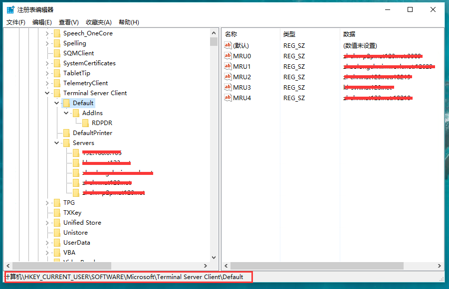 删除远程桌面历史记录 远程登录某个地址后,会在远程桌面里留下一条历史记录,如图: 这个历史记录,是保存在注册表里面的,如图: 删除Default下面相应的记录,然后再删除Servers下相应的文件夹,即可。 PC PC win10设置自动登录 上一篇 去掉win7打开程序时的安全提醒 下一篇