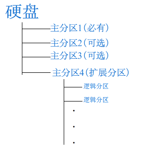 逻辑分区:4个分区肯定不够,我想要20个分区,怎么办呢?把其中一个主分区变成扩展分区,然后在这个扩展分区上进行切割,变成一个个D盘,E盘,F盘什么的,但是这些盘综合起来就是一个扩展分区,这些盘是相互链接的,并不像主分区那样,4个之间相互独立互不干扰。逻辑分区用链表进行链接,如果E盘中的分区信息丢掉,操作系统就找不到F盘了。