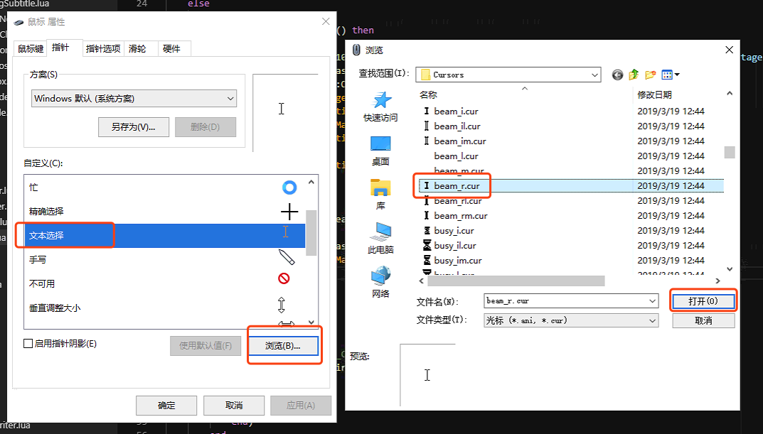 vscode 黑色主题下鼠标指针在工作区不明显 如题,vscode 黑色主题下鼠标指针在工作区不明显。 解决方法:控制面板 -> 鼠标 -> 指针 -> 文本选择 -> 浏览,可以选 beam_r.cur ,带一个白色边框,这样在任何场景下都很容易看清楚了。 PC PC VSCode Mac 修改 hosts 上一篇 Git 的全局设置 下一篇