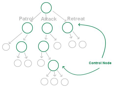可以看到,控制节点其实就是“控制”其子节点(子节点可以是叶节点,也可以是控制节点,所谓“执行控制节点”,就是执行其定义的控制逻辑)如何被执行,所以,我们可以扩展出很多其他的控制节点,比如循环(Loop)等,与行为节点不同的是,控制节点是与游戏无关的,因为他只负责行为树逻辑的控制,而不牵涉到任何的游戏代码。如果是作为一个行为树的库的话,其中就一定会包含定义好的控制节点库。