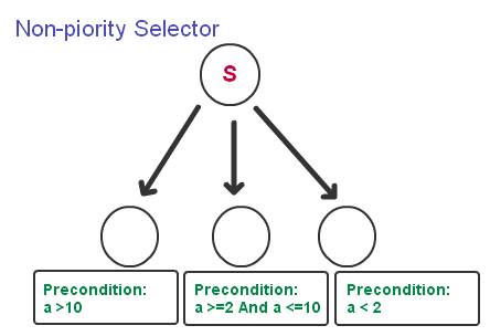 - 不带优先级的选择节点(Non-priority Selector):这种选择节点的选择顺序是从上一个执行过的子节点开始选择,如果前提满足,则继续执行此节点,如果条件不满足,则从此节点开始,依次判断每一个子节点的前提,当找到一个满足条件的子节点后,则执行该节点。这种方式,是基于一种称之为“持续性”的假设,因为在游戏中,一个行为一般不会在一帧里结束,而是会持续一段时间,所以有时为了优化的目的,我们可以优先判断上一个执行的节点,当其条件不满足时,再寻找下一个可执行的节点。这种寻找方式不存在哪个节点优先判断的问题,所以对于前提的设置的要求,就是要保证“互斥”(Exclusion)。如果我们用上面第一张图来说明,如果我们把控制节点换成不带优先级的选择节点,可以看到,当a=3时,第二个子节点会被执行,下一次当a变成9时,由于不是从头依次判断前提的,所以,我们还是会选择第二个节点,而不是我们可能期望的第一个节点。正确的做法见下图,注意每一个子节点的前提是“互斥的”。所以对于不带优先级的选择节点,它子节点的排列顺序就不是那么重要了,可以任意排列。