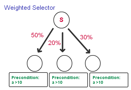 - 带权值的选择节点(Weighted Selector):对于这种选择节点,我们会预先为每一个分支标注一个“权值”(Weight Value),然后当我们选择的时候,采用随机选择的方式来选,随机时会参考权值,并且保证已经被测试过的节点的不会再被测试,直到有一个节点的前提被满足,或者测试完所有的节点。带权值的选择节点对于子节点前提由于随机的存在,所以子节点的前提可以任意,而不会发生“饿死”的情况,一般来说,我们通常会把所以子节点的前提设为相同,以更好的表现出权值带来的概率上的效果。当所有子节点的权值一样时,这种选择节点就成为了随机选择节点(Random Selector),带权值的选择节点对于需要丰富AI行为的地方,非常适用,比如养成类游戏中,小狗表示开心的时候,可能会有各种各样的表现,我们就可以用这种选择节点,添加各种子节点行为来实现。