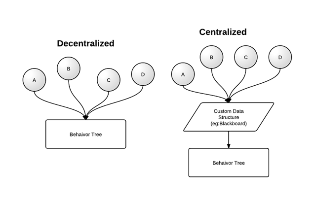 集中的方式的话,就是我们可以定义一个数据结构专门用于行为树的输入,将上面提到的需要用到的数据,在进行行为树决策前,先从各个模块中收集到这个数据结构里,然后再递交给行为树使用。集中式的输入减少了输入和行为树之间的接口数量(只和预定义的数据结构通信),但缺点是,存在数据冗余。不过,我们可以看到集中式的数据输入使得行为树的表现更像一个黑盒了(可以伪造数据来测试行为树),这也是我们一直以来想要的。可以参看下面对于两种方式的示意图: