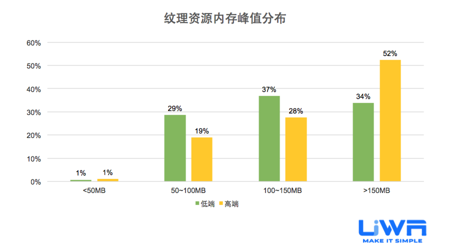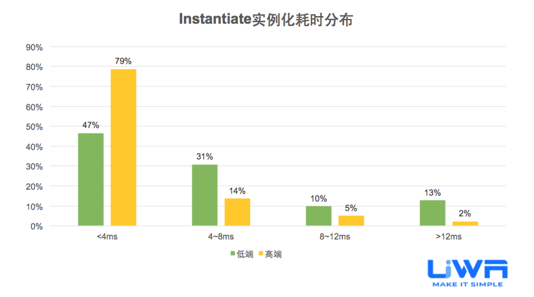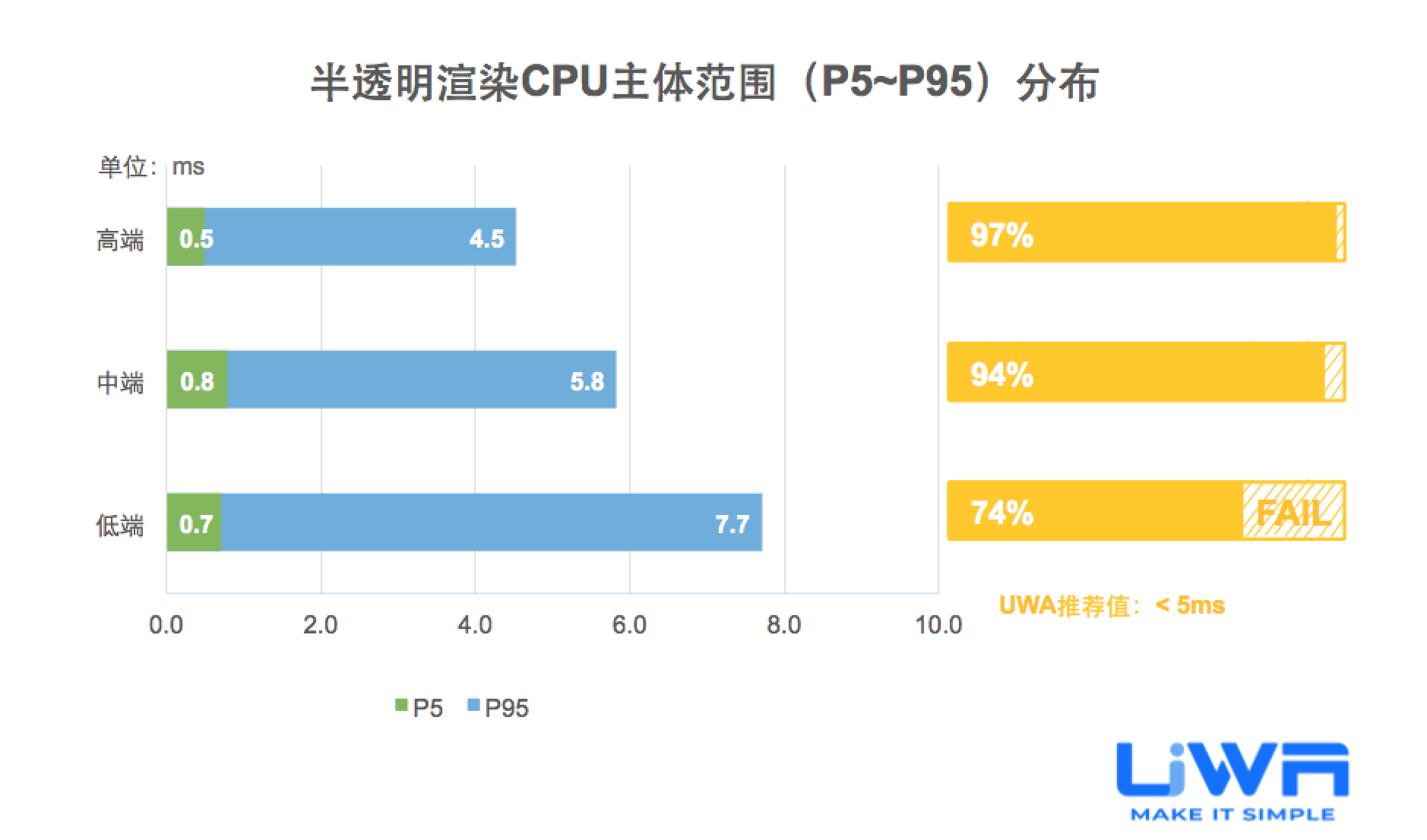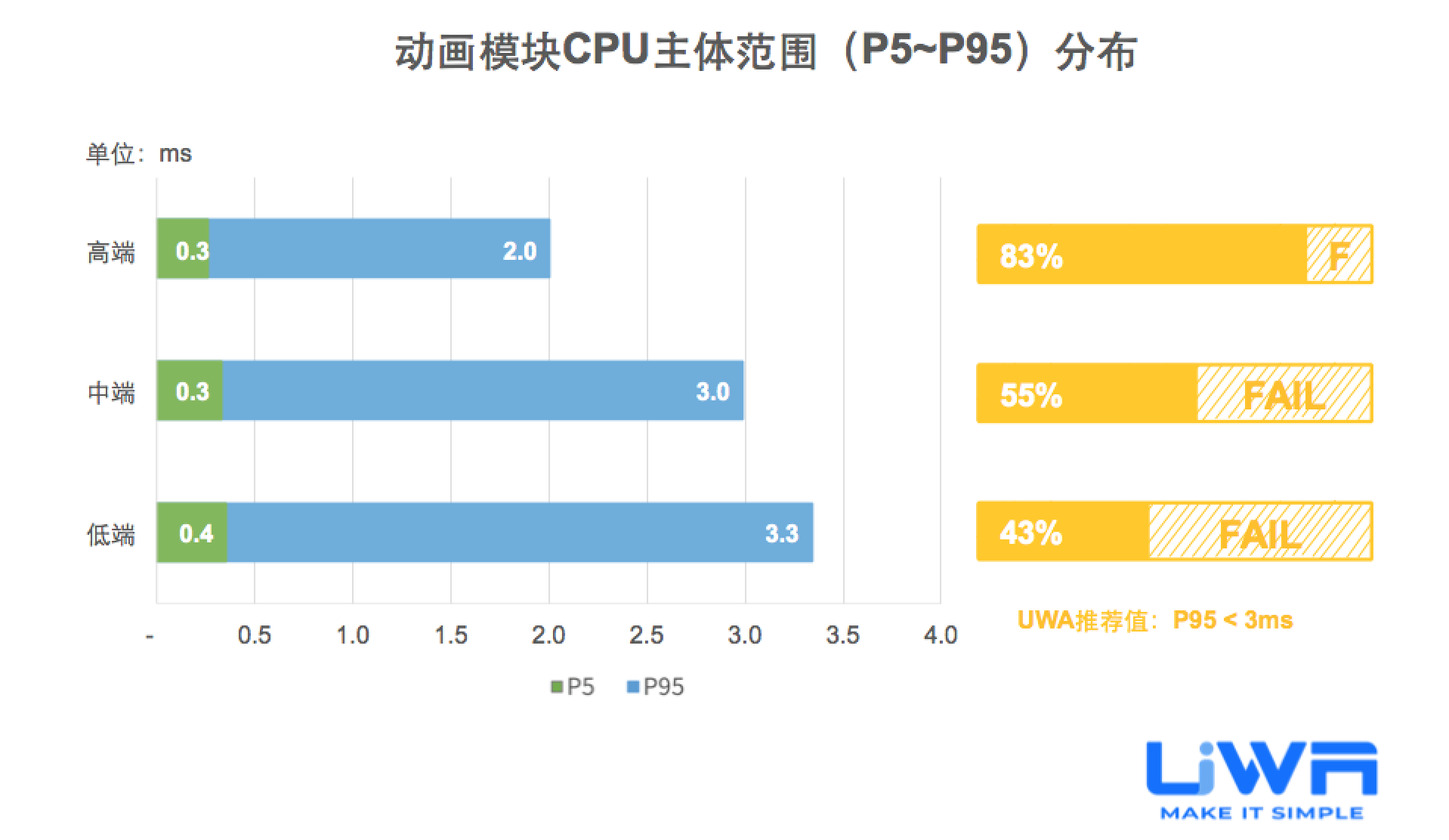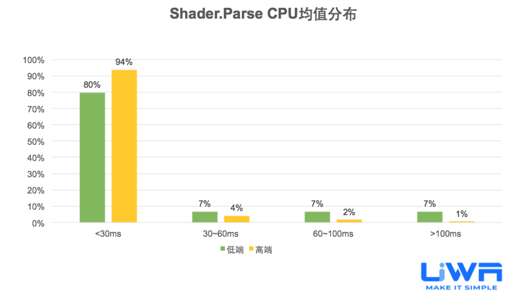 大部分卡牌手游在中低端设备的性能开销较好,大于33ms的耗时占比范围仅占30%。