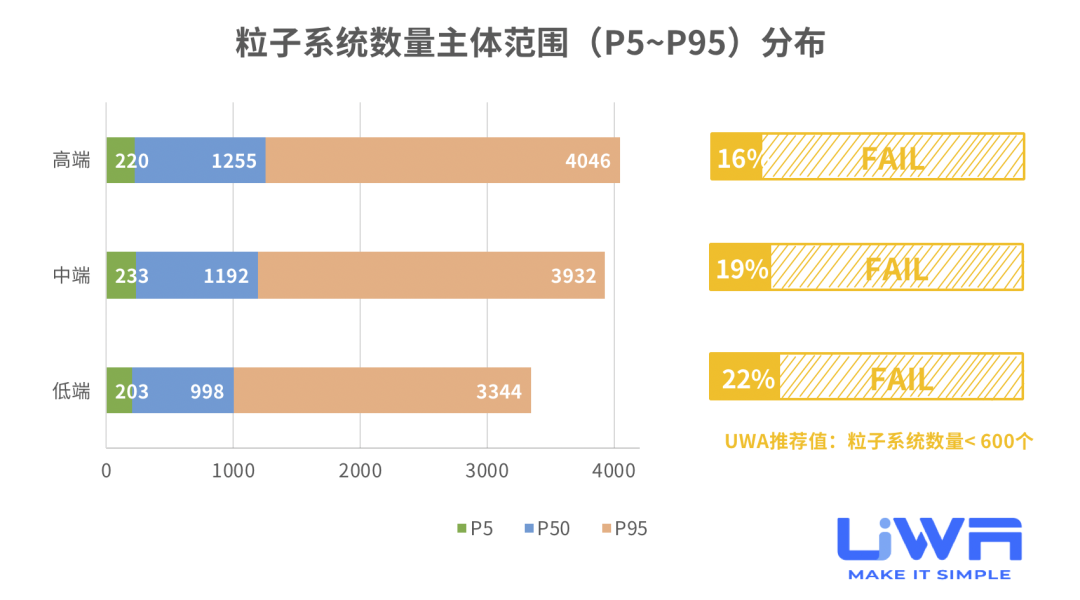 粒子系统的CPU开销普遍较低,但总体使用数量峰值在2020 Q1后大幅上升。我们依然建议研发团队尽可能将数量峰值控制在600以下(低端设备)和1000以下(中高端设备)。对此,建议研发团队经常通过以下两方面来检测自己的粒子特效使用情况: