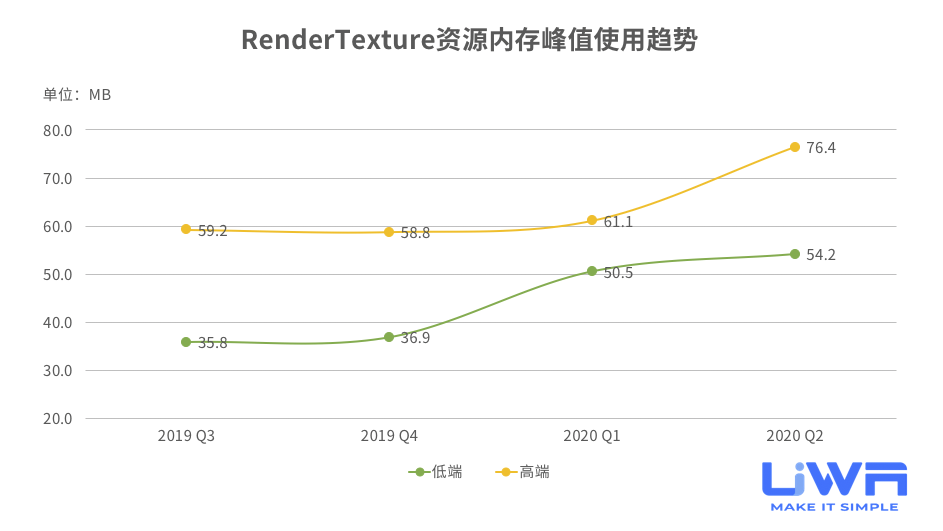 RenderTexture的内存占用在进入2020年Q1以后上升趋势明显,特别是在低端设备上,随着大家对于图像后处理效果的需求提升,后续很可能会出现RenderTexture使用程度大幅提升的情况,因此,建议研发团队对RenderTexture密切关注。