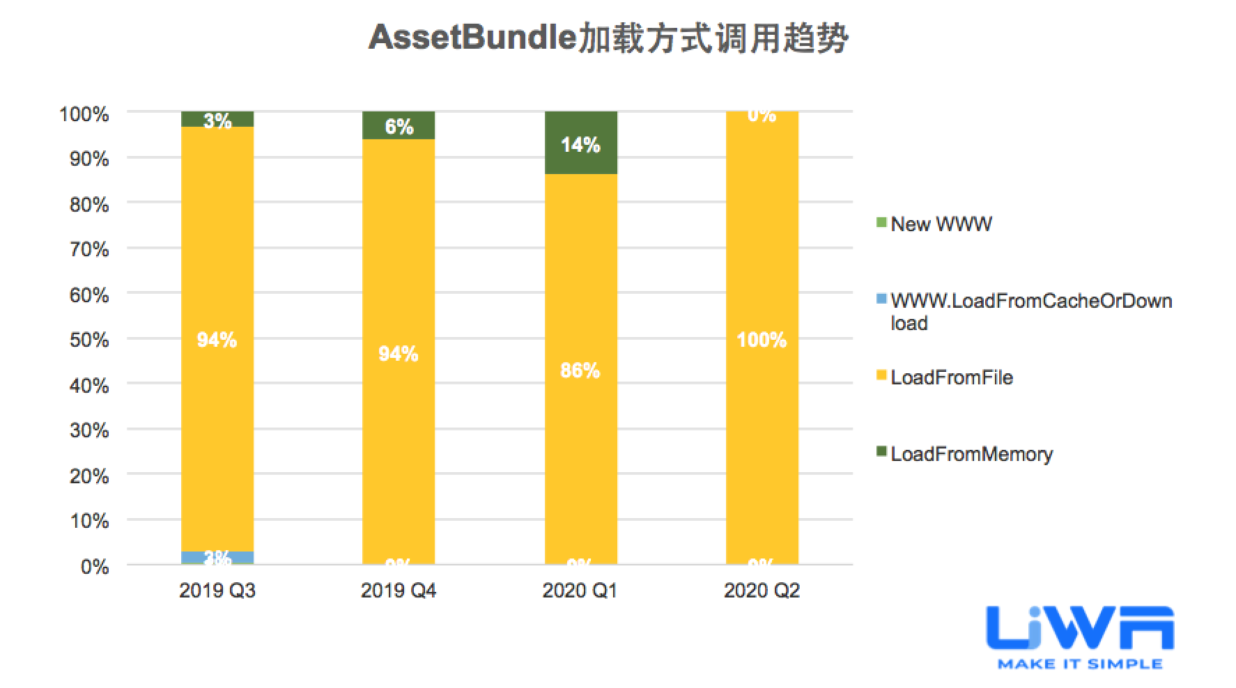AssetBundle加载方式(Load和LoadAsync)的使用占比在过去的一年中都保持在80%左右。毫无疑问,AssetBundle加载方式是目前绝大多数研发团队的资源加载首选。