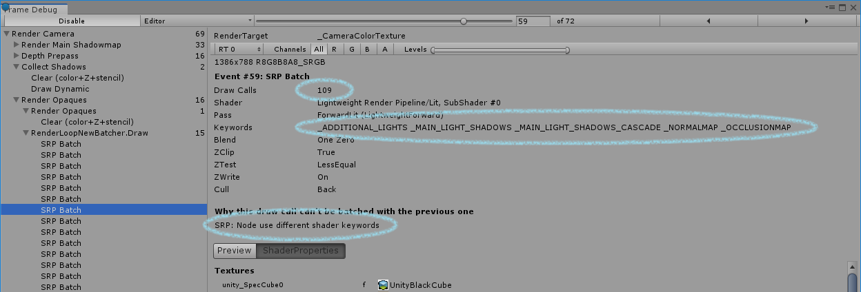 请参阅左侧的 SRP Batch 事件。另请参阅批次的大小,即 Draw Calls 的数量(此处为 109)。这是一个非常有效的批次。您还可以看到前一批被破坏的原因(“节点使用不同的着色器关键字”)。这意味着用于该批次的着色器关键字与前一批次中的关键字不同。这意味着着色器变体已更改,我们必须中断批处理。