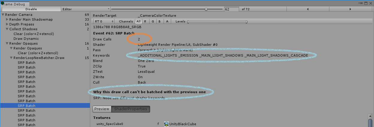 批处理大小仅为 2。这可能意味着您有太多不同的着色器变体。如果您要创建自己的 SRP,请尝试使用最少的关键字编写通用的“超级”着色器。您不必担心在“属性”部分中放置了多少材料参数。