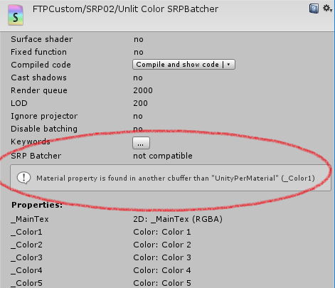 提示 1:始终在检查器中检查新着色器的兼容性状态。我们检查了几个潜在的错误(UnityPerDraw 布局声明等)并显示了它不兼容的原因。