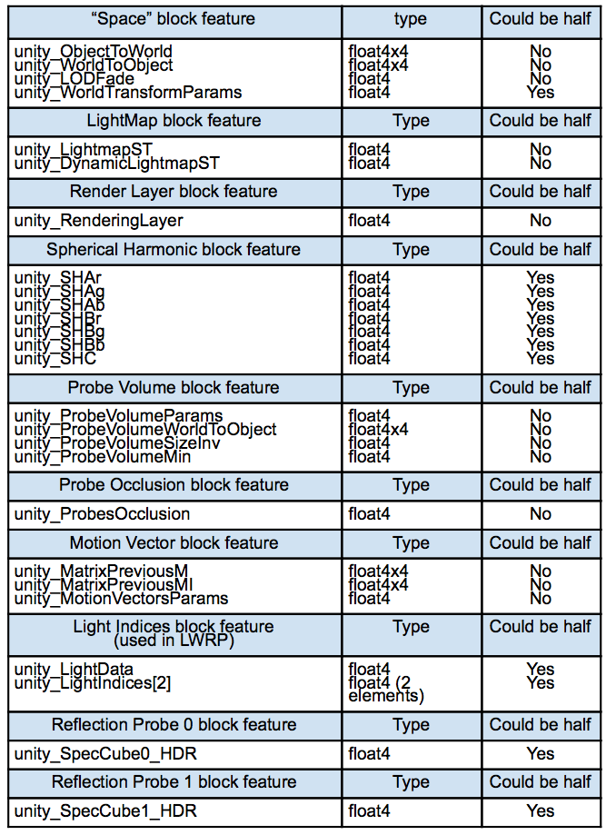 如果您不需要这些块功能,则不必声明其中的某些功能。“UnityPerDraw”中的所有内置引擎变量都应该是 float4 或 float4x4。在移动设备上,人们可能希望使用 real4(16 位编码浮点值)来节省一些 GPU 带宽。并非所有 UnityPerDraw 变量都可以使用“real4”。请参阅“可能是真的4”一栏。