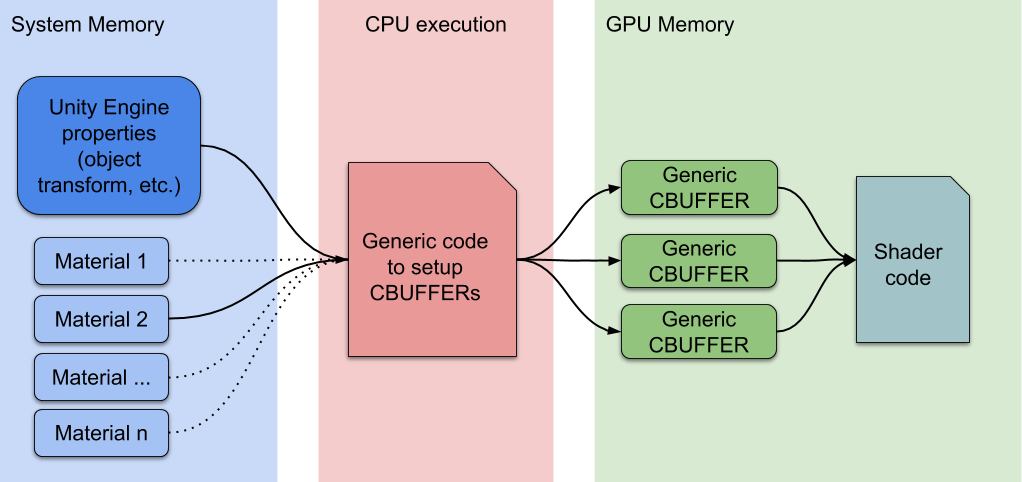 在内部渲染循环期间,当检测到新材质时,CPU 会收集所有属性并在 GPU 内存中设置不同的常量缓冲区。GPU 缓冲区的数量取决于着色器如何声明其 CBUFFER。