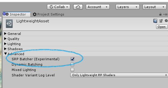 您的项目必须使用轻量级渲染管线 (LWRP)、高清渲染管线 (HDRP) 或您自己的自定义 SRP。要在 HDRP 或 LWRP 中激活 SRP Batcher,只需使用 SRP Asset Inspector 中的复选框。