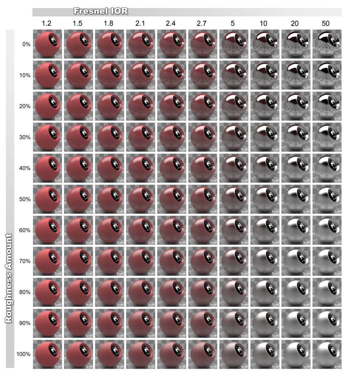 在有些渲染器中,会直接采用折射率IOR来表示材质的属性,以下是一张渲染器中实数折射率、粗糙度二维材质的渲染对照图: