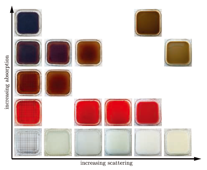 图:具有不同光的吸收量和散射量的介质。 外观取决于散射和吸收两个属性;