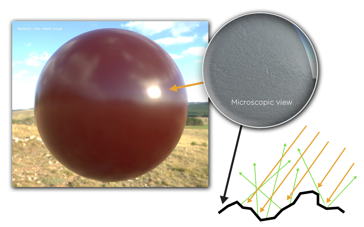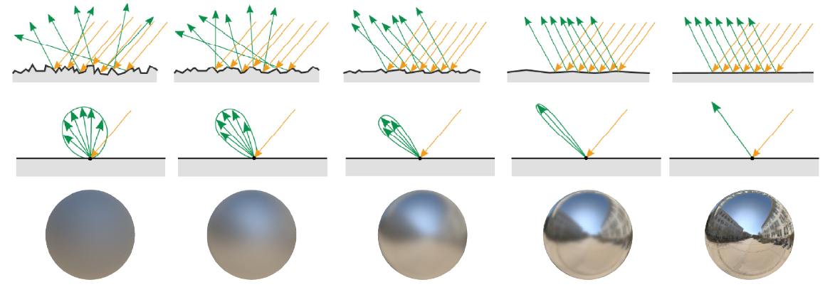 微平面理论(Microfacet Theory)。微平面理论是将物体表面建模成无数微观尺度上有随机朝向的理想镜面反射的小平面(microfacet)的理论。微观几何(microgeometry)的效果是在表面上的不同点处改变微平面的法线,从而改变反射和折射的光方向。出于着色的目的,通常会用统计方法处理这种微观几何现象,将表面视为具有微观结构法线的随机分布,并将宏观表面视为在每个点处多个方向上反射(和折射)光的集合。在微观尺度上,表面越粗糙,反射越模糊,表面越光滑,反射越集中。