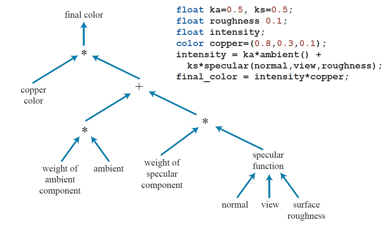 原书图3.3 一个简单的铜着色器(Cook的 shade trees)和其对应的着色语言代码