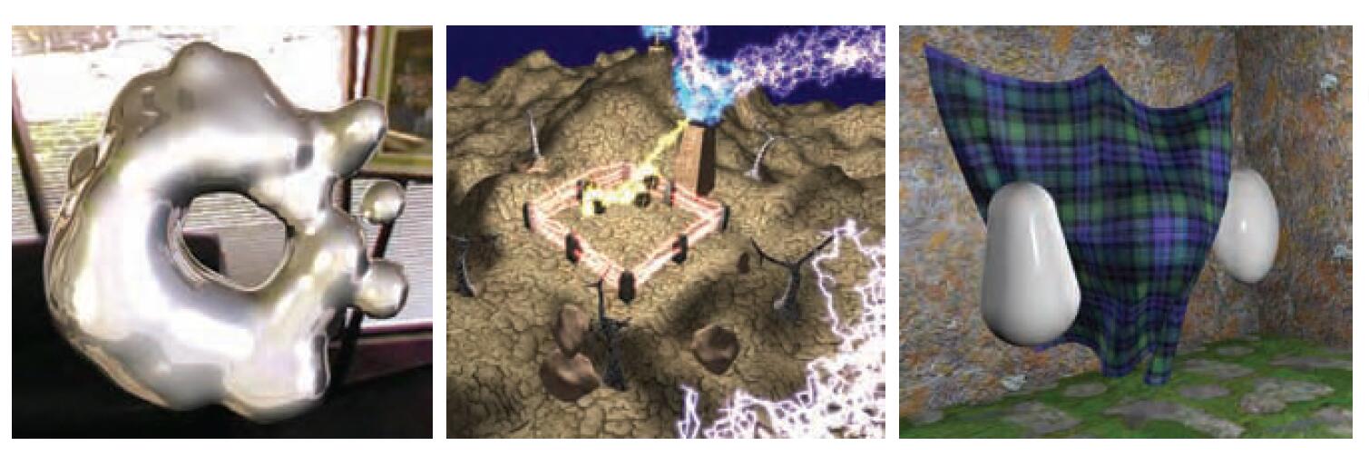3.7.一些几何着色器的应用。左图,使用几何着色器实现元球的等值面曲面细分(metaball