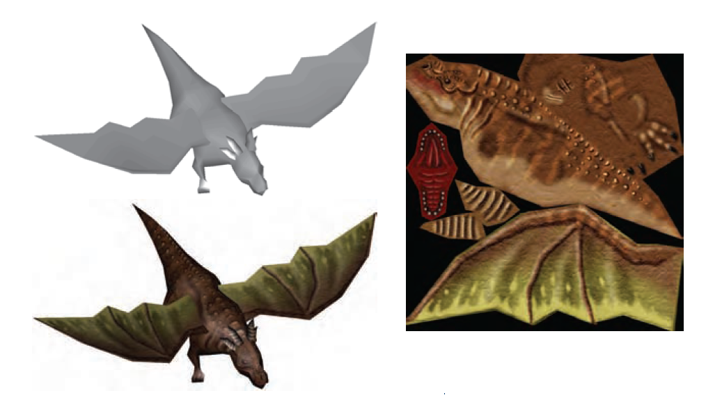 左上角为一没有纹理贴图的飞龙模型。左下角为一贴上图像纹理的飞龙。右图为所用的纹理贴图。