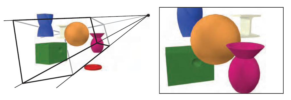 左图中,相机放在棱椎的顶端(四条线段的交汇点),只有可视体内部的图元会被渲染。