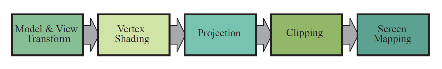 几何阶段主要负责大部分多边形操作和顶点操作,可以将这个阶段进一步划分成如下几个功能阶段:模型视点变换、顶点着色、投影、裁剪、屏幕映射。这些功能阶段的主要功能如下: