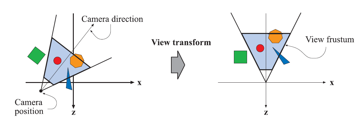 在左图中,摄像机根据用户指定的位置进行放置和定位。在右图中,视点变换从原点沿着Z轴负方向对相机重新定位,这样可以使裁剪和投影操作更简单、更快速。可视范围是一个平截椎体,因此可以认为它是透视模式。