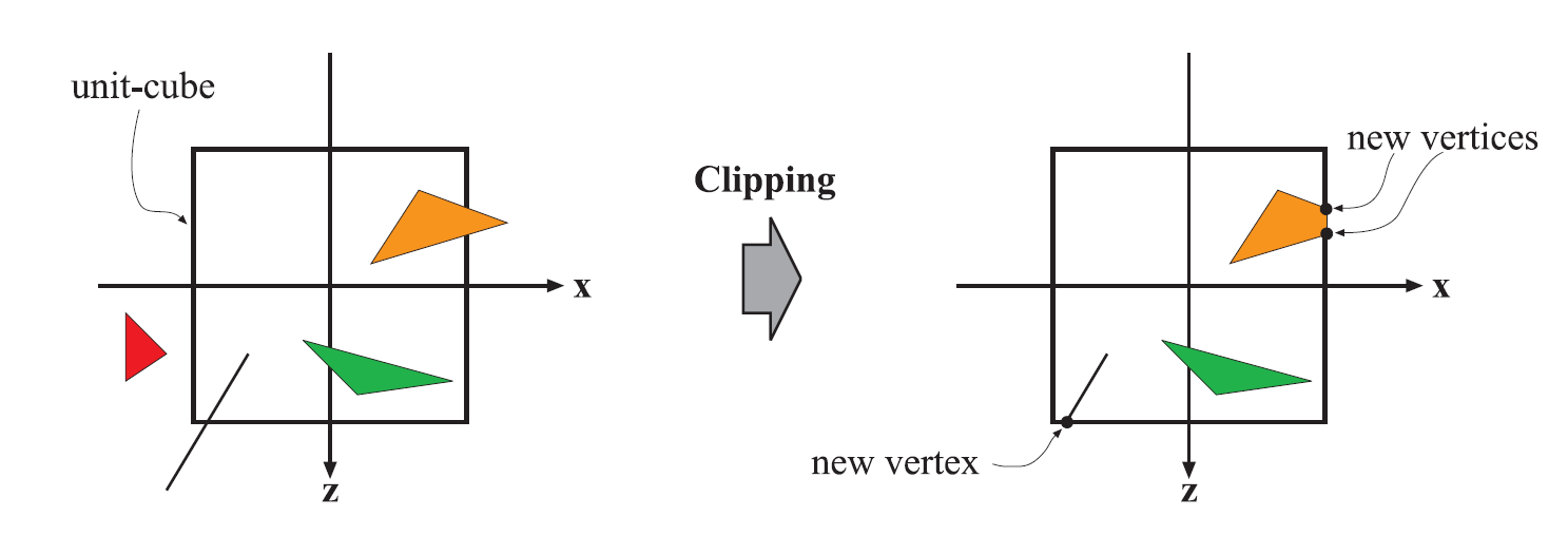 投影变换后,只对单位立方体内的图元(相应的是视锥内可见图元)继续进行处理,因此,将单位立方体之外的图元剔除掉,保留单位立方体内部的图元,同时沿着单位立方体将与单位立方体相交的图元裁剪掉,因此,就会产生新的图元,同时舍弃旧的图元。