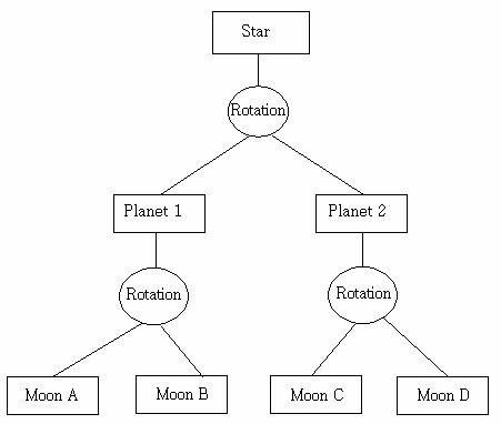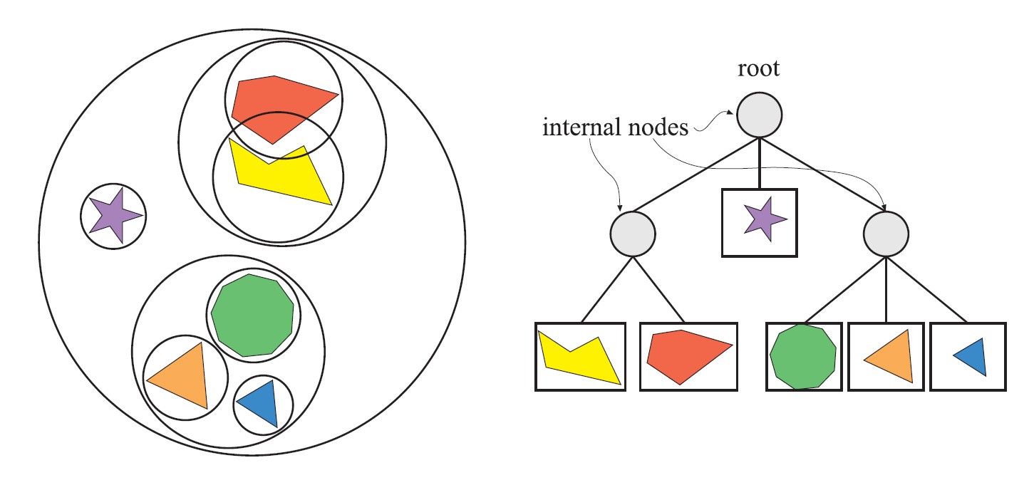 左图为一个包含6个物体的简单场景,每个物体由一个包围的球体封闭起来,其中可以将包围球体归组为一个更大的包围球体,如此内推,直到所有的物体被最大的球体包围,右图所示为层次包围体(树),可以用来表示左图的物体层次、根节点的包围体包含场景中的所有物体。