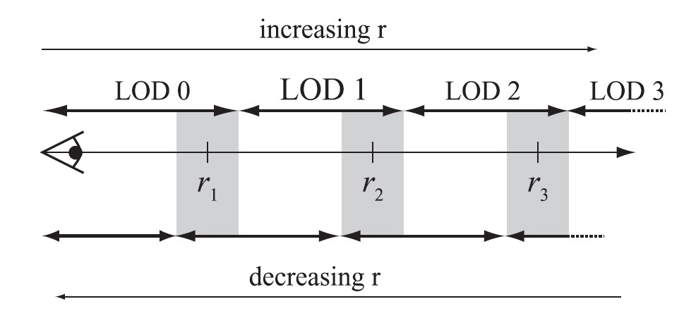 若用于确定LOD度量标准围绕某个值ri在画面之间是变化的,那么就会出现不必要的突跃现象,也就会在不同的LOD之间来回快速切换。对此,可以引入一个围绕ri值的滞后来解决这个问题。如下图,这是一个基于距离的LOD,可以应用于任何类型,当r增大时,使用上一行的LOD距离;当r减小时,使用下面一行的LOD距离。