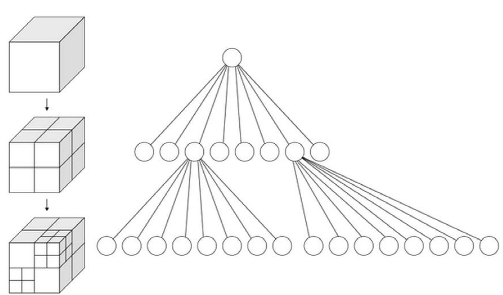 八叉树是规则的,意味着空间是以一种均匀的形式进行分割,虽然这种均匀性限制比较大,但这种均匀性常常是效率的源泉。另外值得注意的是,八叉树是四叉树的三维空间推广。