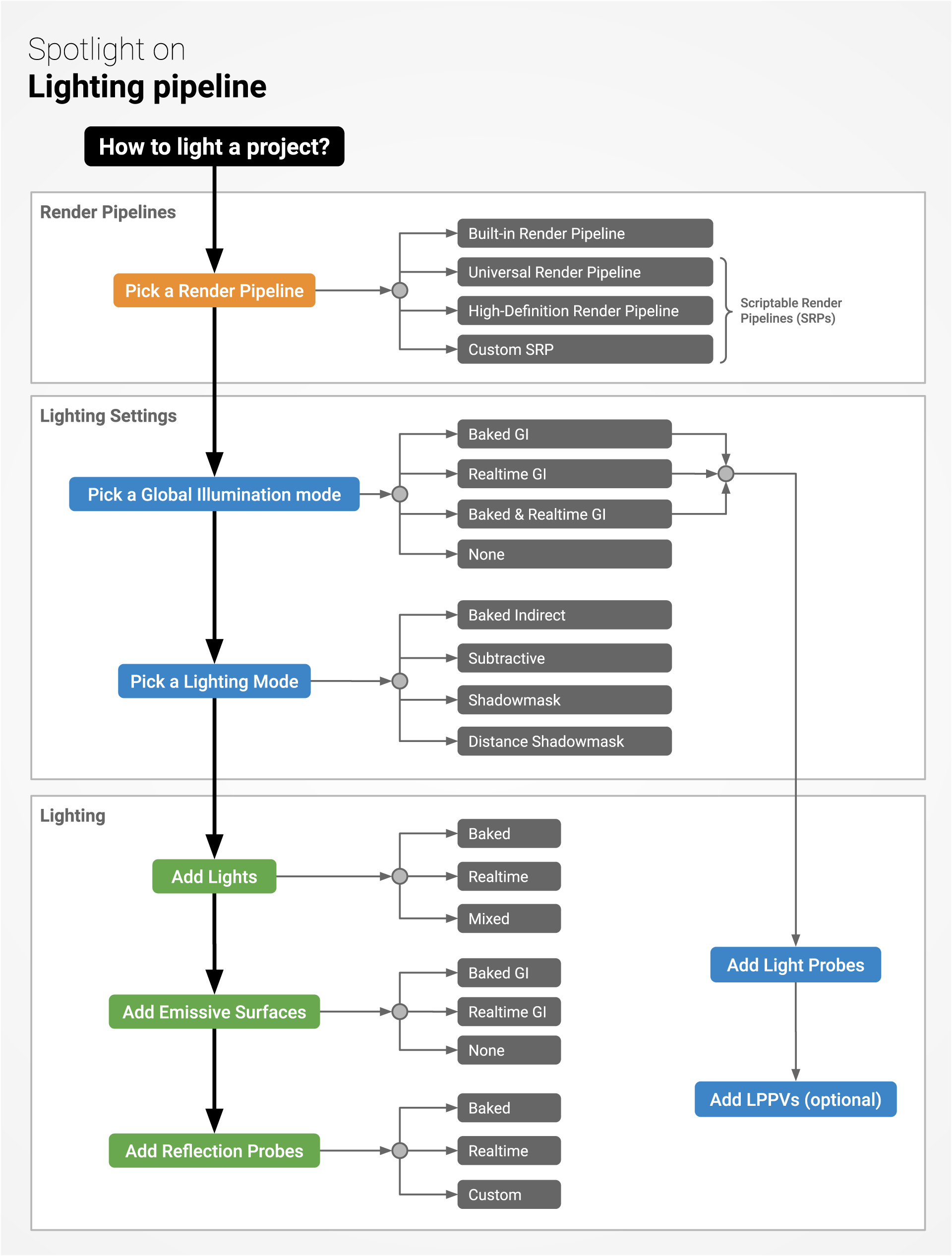 下面的流程图从内容创建者的角度,大致显示了 Unity 中的整个光照管线。