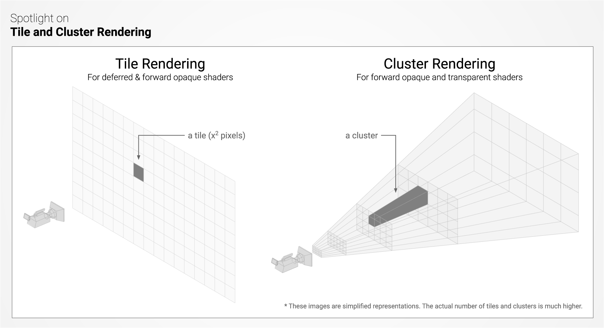 瓦片是帧的一个小型二维方形像素部分,而聚类则是摄像机视锥体中的一个三维体积。瓦片和聚类渲染技术都依赖于影响每个瓦片和聚类的光源的列表,然后可以用相应的已知光源列表在一个通道中计算其光照。不透明对象很可能使用瓦片系统进行着色,而透明对象则依赖于聚类系统。该渲染器的主要优点是,与内置渲染管线(延迟)相比,光照处理速度更快,带宽消耗也大大减少,因为内置渲染管线依赖于更慢的多通道光照积累。