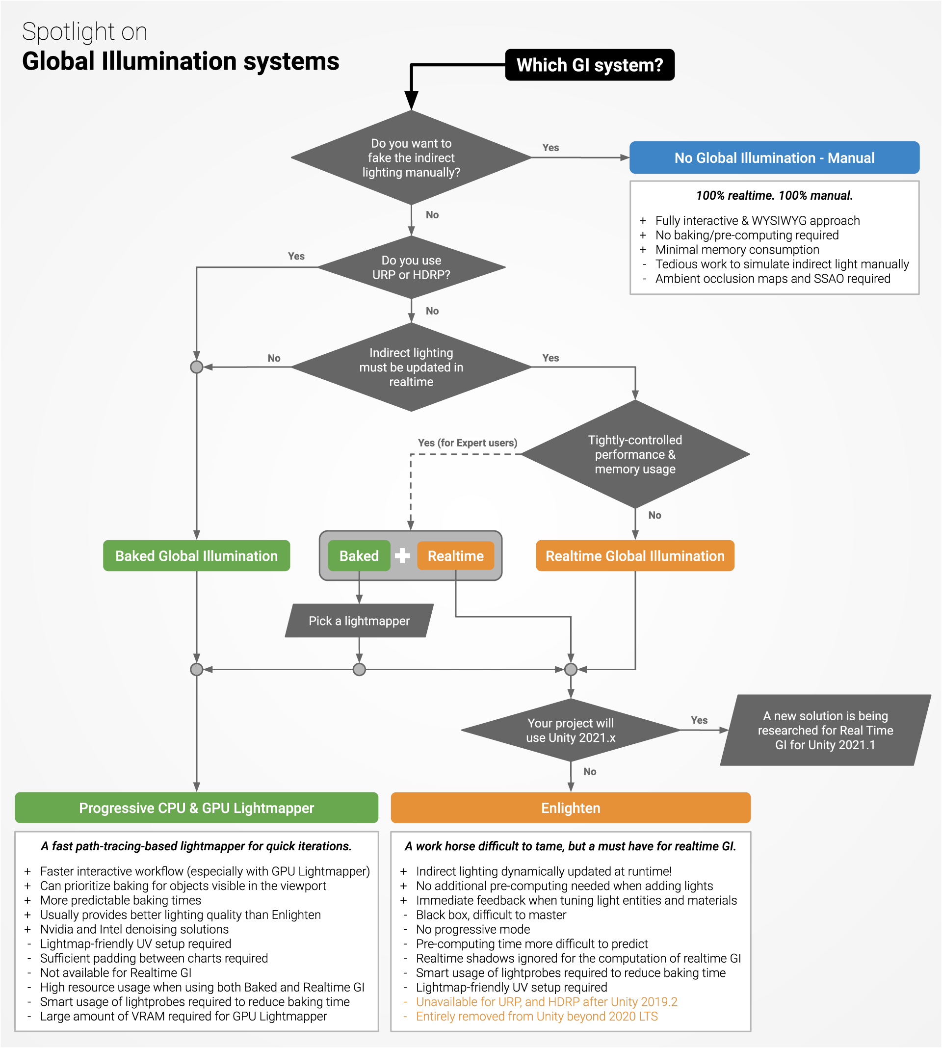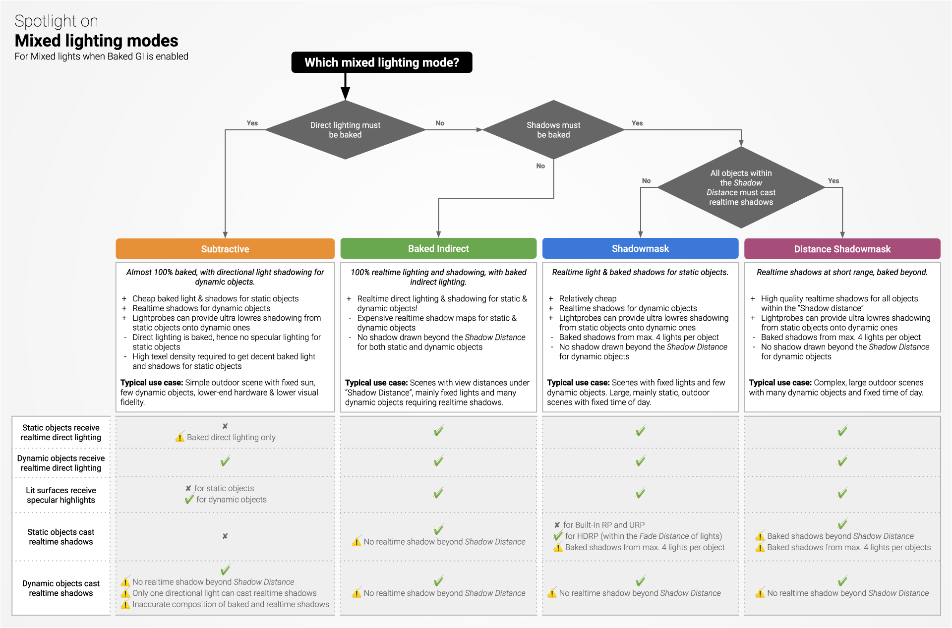 下面的图表结合了一个决策流程图和一个比较表;可以帮助您决定每次在场景中添加新光源时哪种光源模式合适。