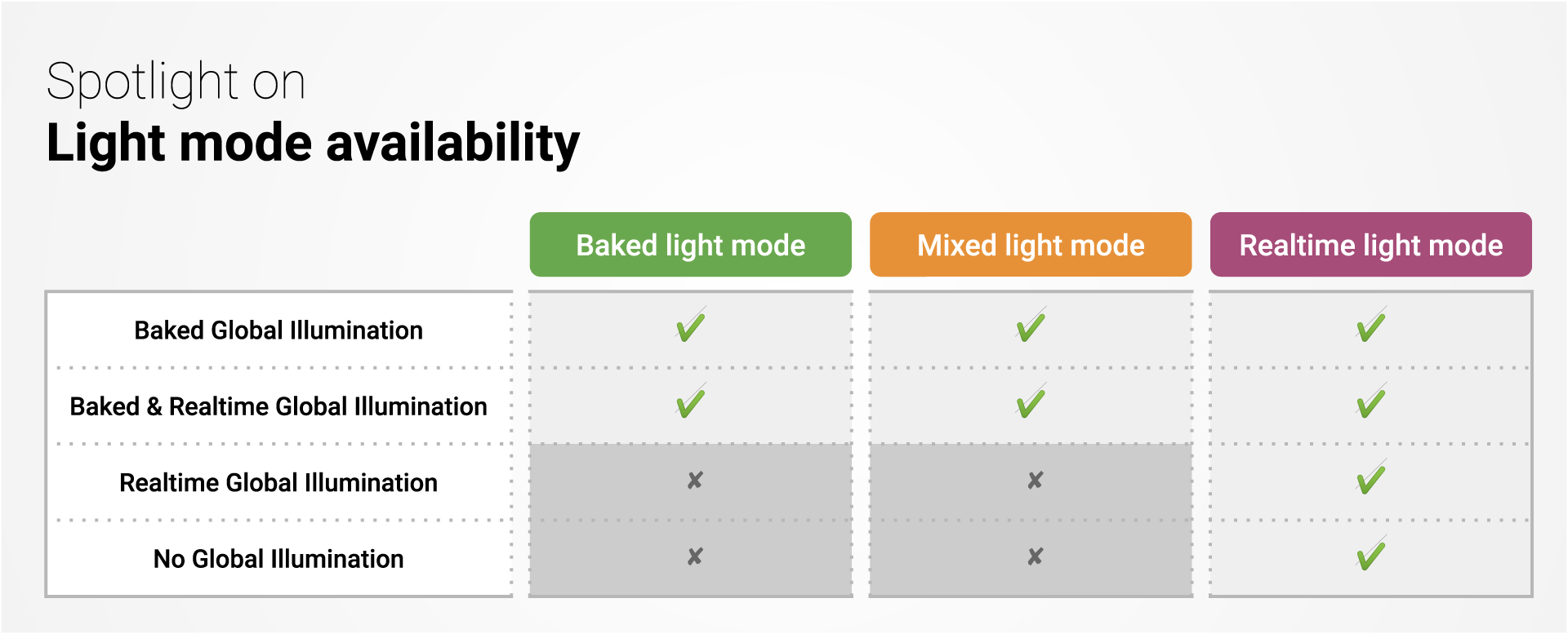 如前面的图表中所示,场景中的所有混合光源具有特定的烘焙和实时功能,具体取决于您在 Lighting 窗口中选择的光照模式 (Lighting Mode)。