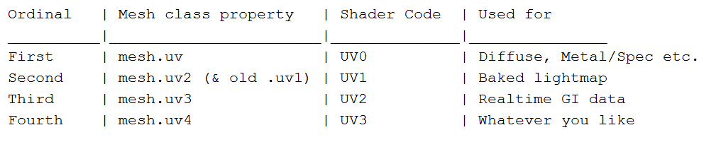 Unity 一共支持 4 套 UV,在 Shader 编程中,分别叫 UV0、UV1、UV2、UV3,而在 C# 编程中分别叫 mesh.uv、mesh.uv2、mesh.uv3、mesh.uv4。
