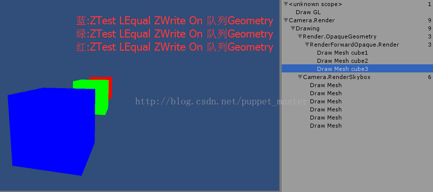 可以看出,Unity 中对于不透明的物体,是采用了从前到后的渲染顺序进行渲染的,这样,不透明物体在进行完 vertex 阶段,进行 Z Test,然后就可以得到该物体最终是否在屏幕上可见了,如果前面渲染完的物体已经写好了深度,深度测试失败,那么后面渲染的物体就直接不会再去进行 fragment 阶段。(不过这里需要把三个物体之间的距离稍微拉开一些,本人在测试时发现,如果距离特别近,就会出现渲染次序比较乱的情况,因为我们不知道 Unity 内部具体排序时是按照什么标准来判定的哪个物体离摄像机更近,这里我也就不妄加猜测了)