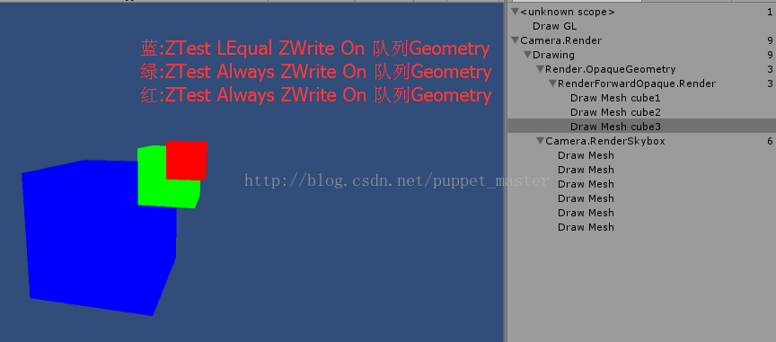 通过上面的实验结果,我们知道,按照从前到后的渲染顺序,首先渲染蓝色物体,蓝色物体深度测试通过,颜色写入缓存,但是关闭了深度写入,蓝色部分的深度缓存值仍然是默认的 Max,后面渲染的绿色立方体,进行深度测试仍然会成功,写入颜色缓存,并且写入了深度,因此蓝色立方体没有起到遮挡的作用。